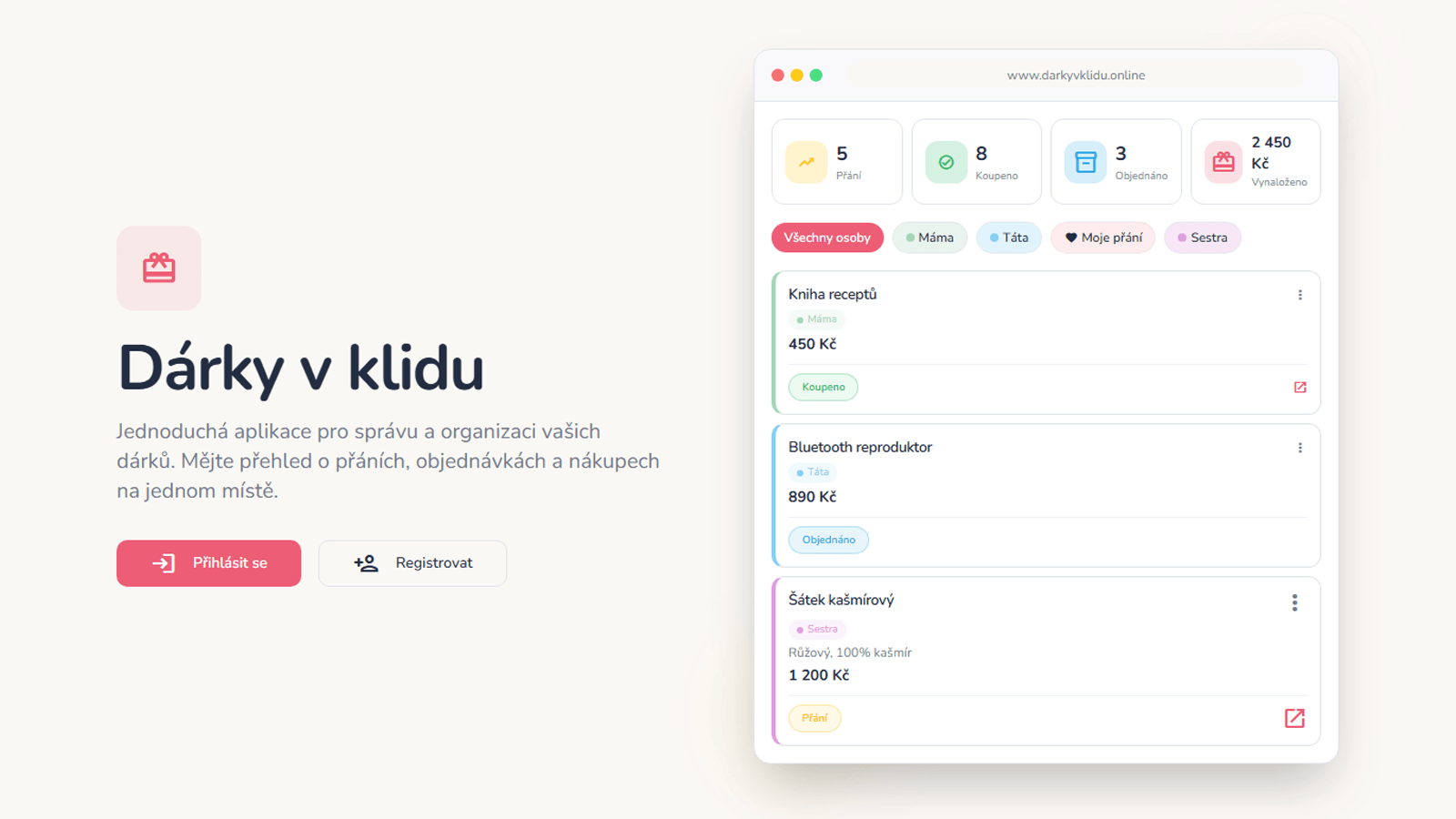 Jednoduchá aplikace pro správu a organizaci vašich dárků. Mějte přehled o přáních, objednávkách a nákupech na jednom místě.